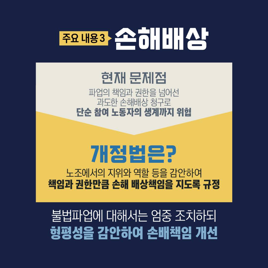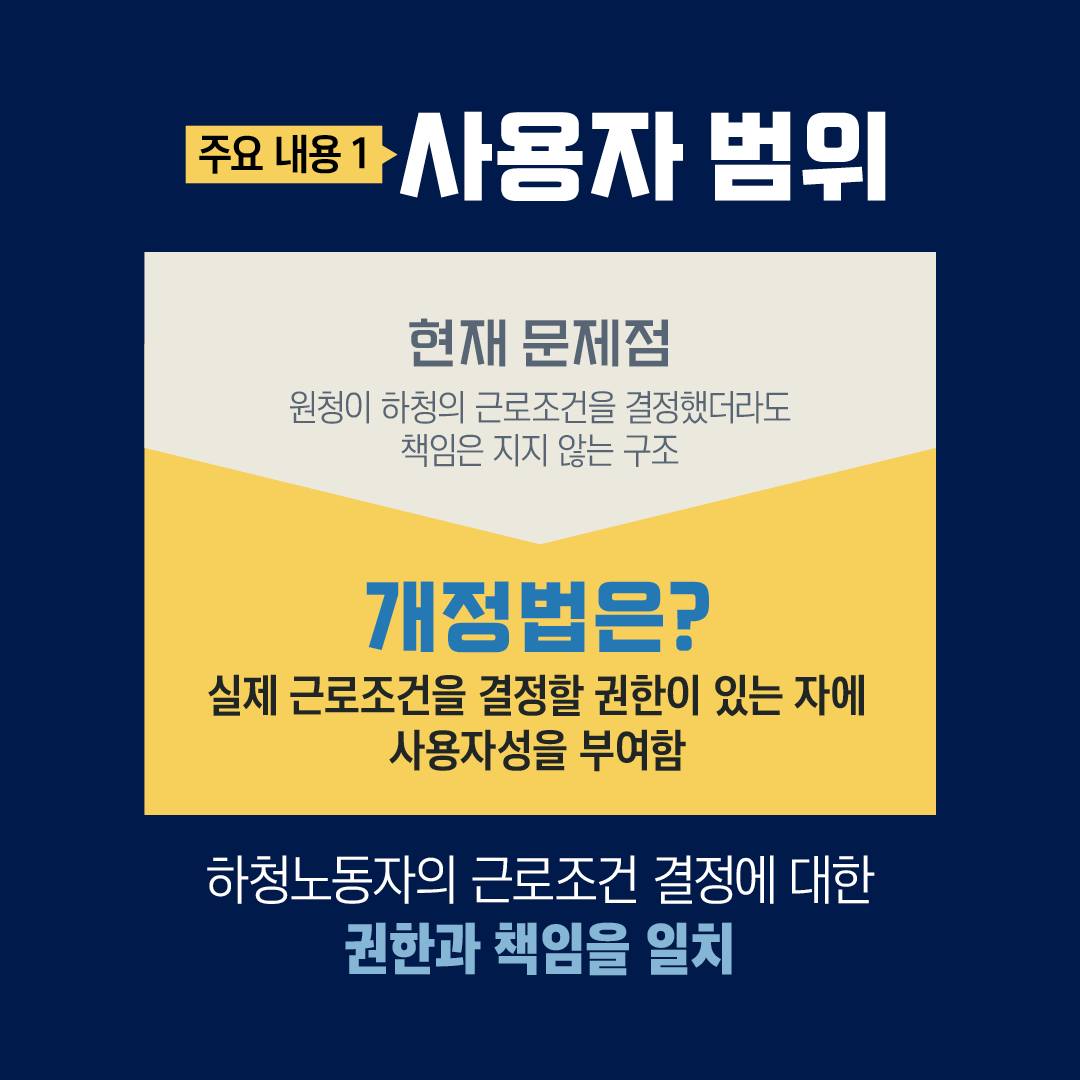 이번 개정은 △사용자성 확대 △노동쟁의 범위 확대 △손해배상 책임비율 제한이 핵심 내용입니다. 고용노동부는 6개월 준비기간 동안 현장지원 TF를 운영해 지침과 매뉴얼을 마련하고, 교섭 표준모델과 같은 상생 교섭 방안도 추진할 계획입니다.
