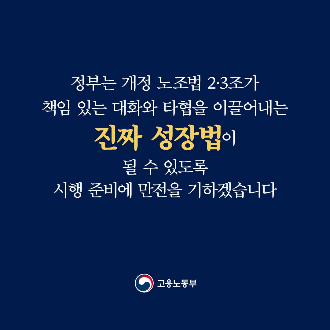 김영훈 장관은 “개정 취지가 현장에서 제대로 작동할 수 있도록 최선을 다하겠다”며, 노사 모두가 참여와 협조를 통해 새로운 노사관계 정착에 힘써줄 것을 당부했습니다.
