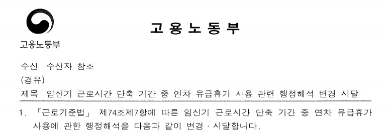 - 임신기 근로시간 단축 기간 중 연차 유급휴가 사용 행정해석 변경내용과 영향👶🏻