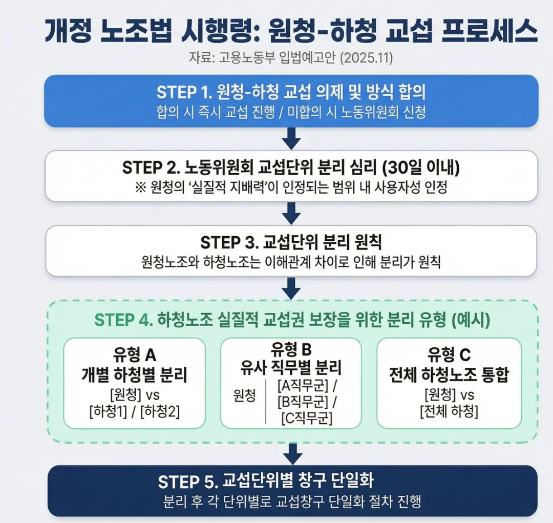 예컨대 원청노조 1개·하청노조 3개가 있는 경우 ① 원청노조와 하청노조는 원칙적으로 분리되고, ② 3개 하청노조를 개별로 볼지, 유사군으로 묶을지, 전체를 하나로 볼지는 노동위가 30일 내 결정하게 됩니다. 이는 하청노조의 실제 교섭권을 강화하고 다층적 교섭구조를 제도화하는 방향으로 이해할 수 있습니다.