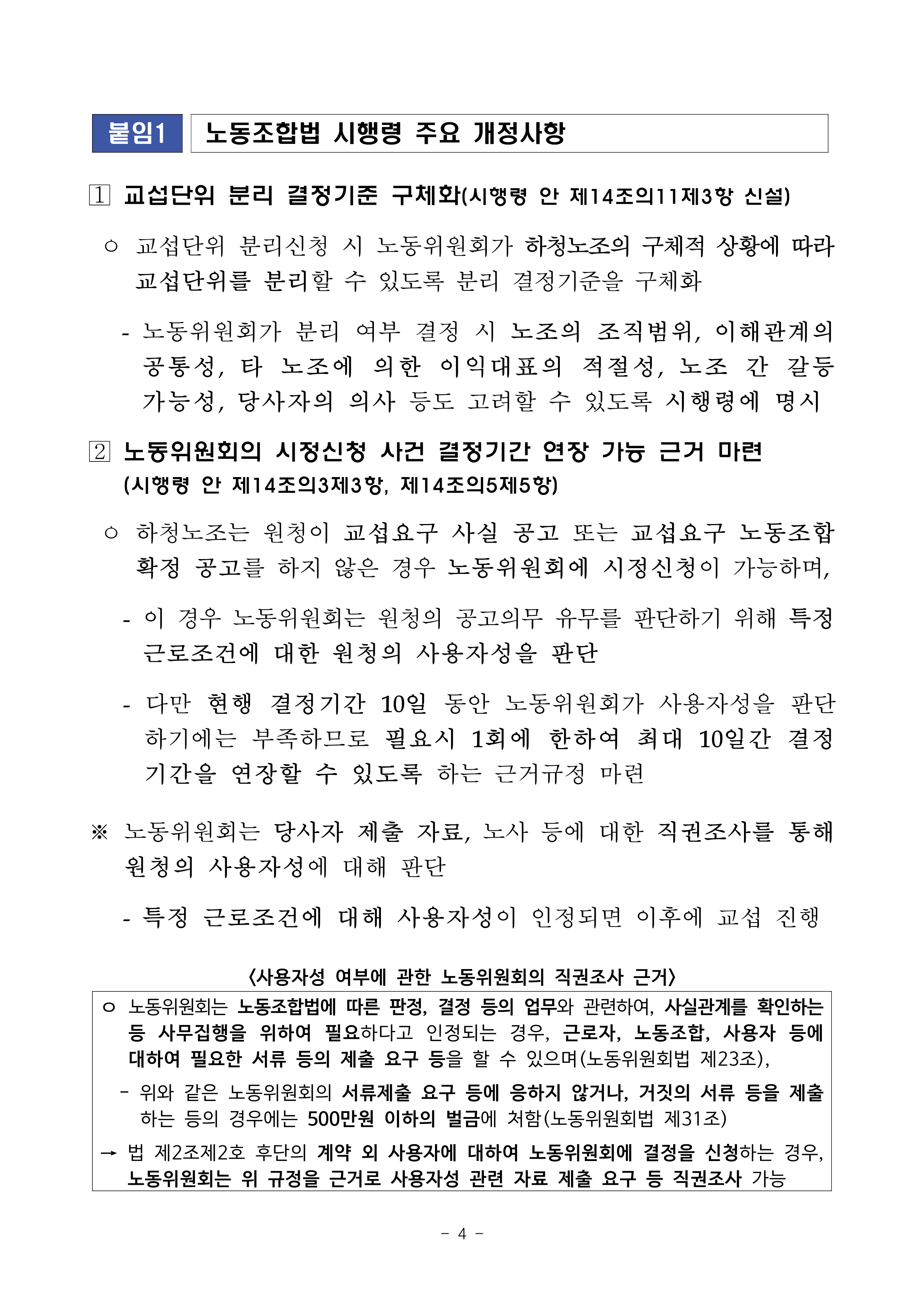 또한 교섭 의제나 사용자성에 대한 의견 충돌 시 판단을 돕기 위해 ‘사용자성 판단지원위원회’가 신설될 예정입니다. 법적 구속력은 없지만, 이를 토대로 하청노조가 부당노동행위 구제 절차를 밟을 수 있는 만큼 기업에도 실질적인 영향을 미칠 것으로 보입니다.